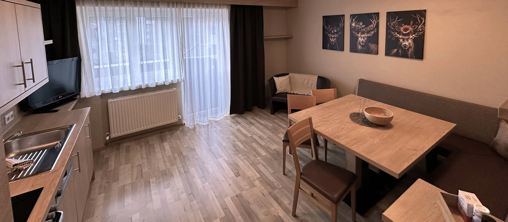 Das Appartement ist ca. 80 m² und und bietet genügend Platz für bis zu 6 Personen. Es verfügt über einen Wohn-, Kochbereich und 3 Doppelzimmer mit ca. je 16,5 m²