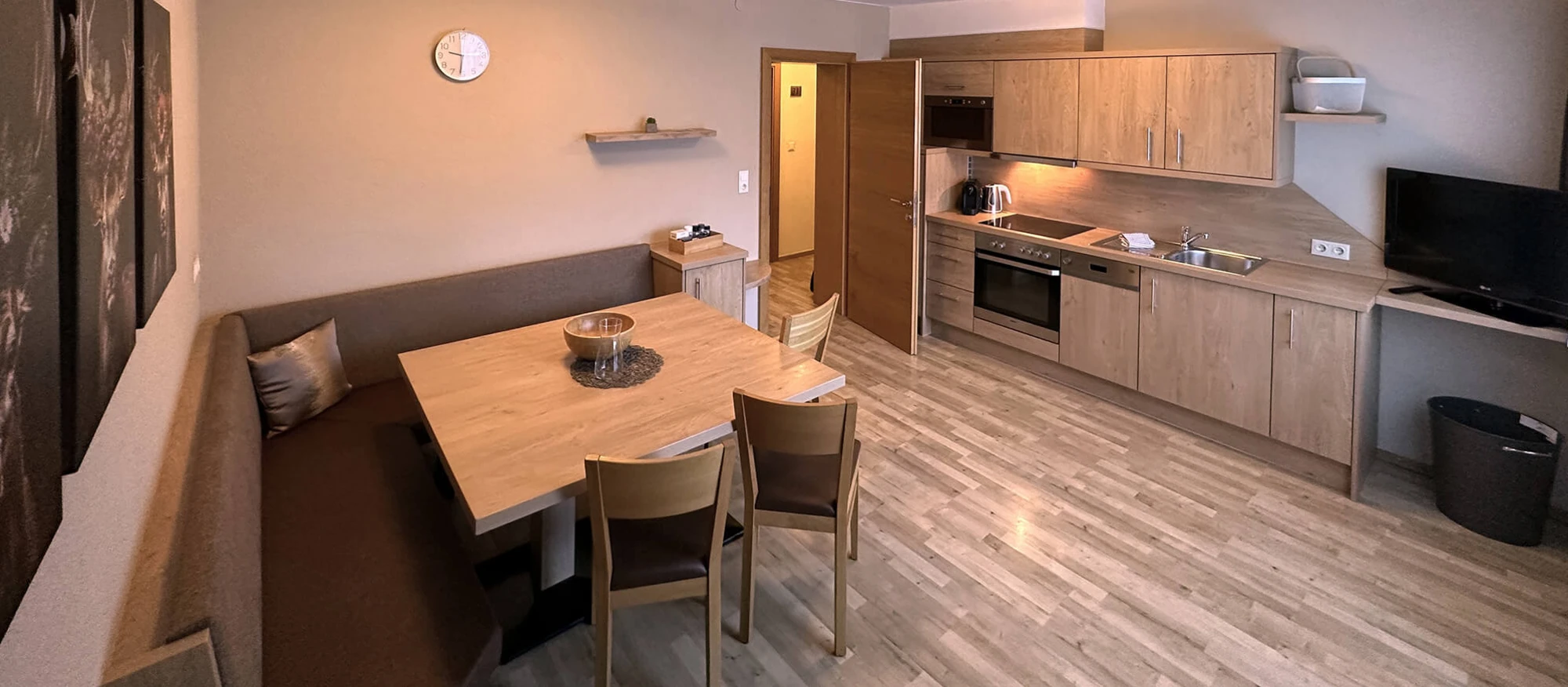 Kühlschrank, Kochfeld, Elektroherd, Wasserkocher, Toaster, Mikrowelle, Spülmaschine, sowie einer Kaffeemaschine (Kapseln Cafissimo), Geschirr, Geschirrtücher, Sitzsessel, Digital-TV und einer Tischsitzecke und Balkon.