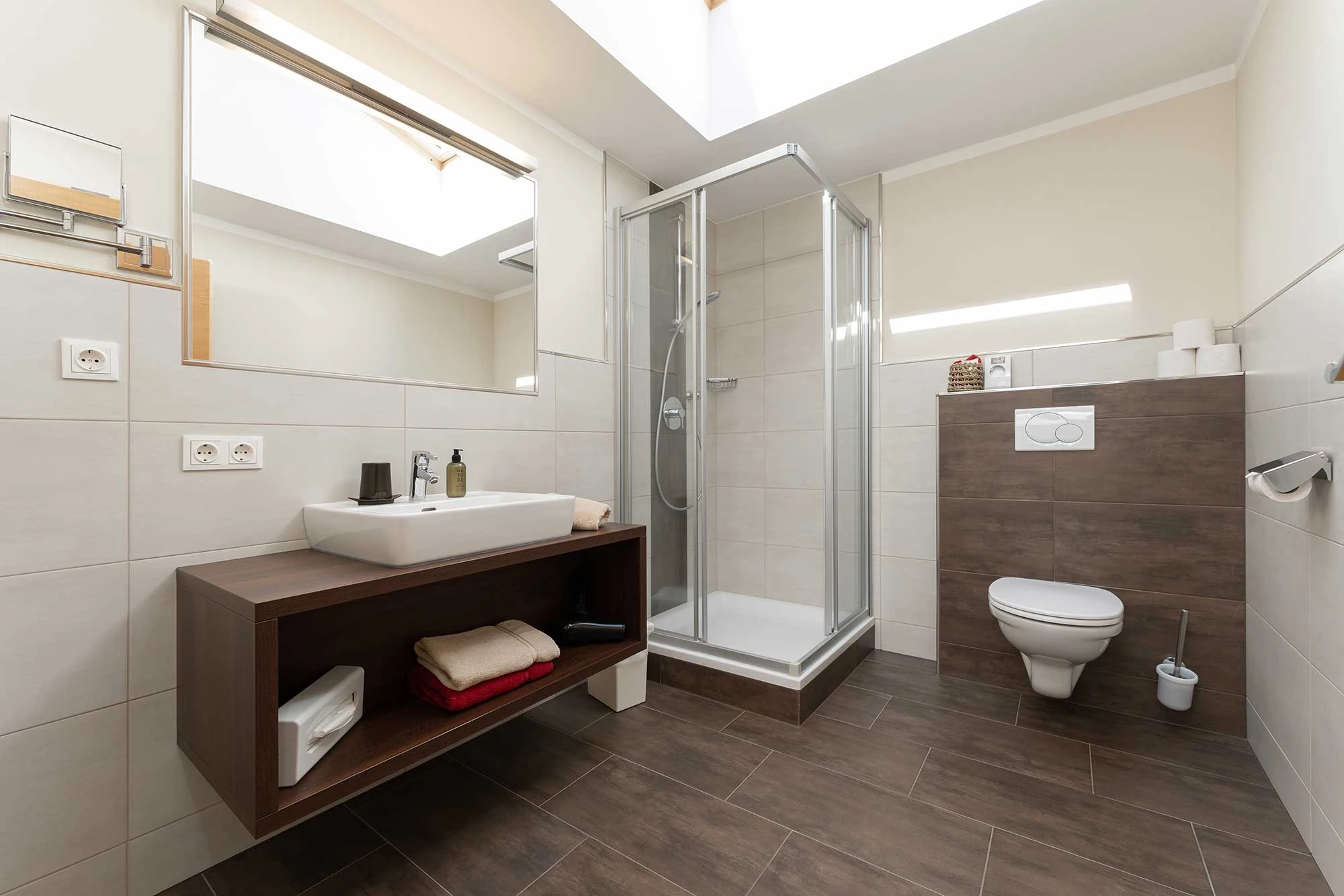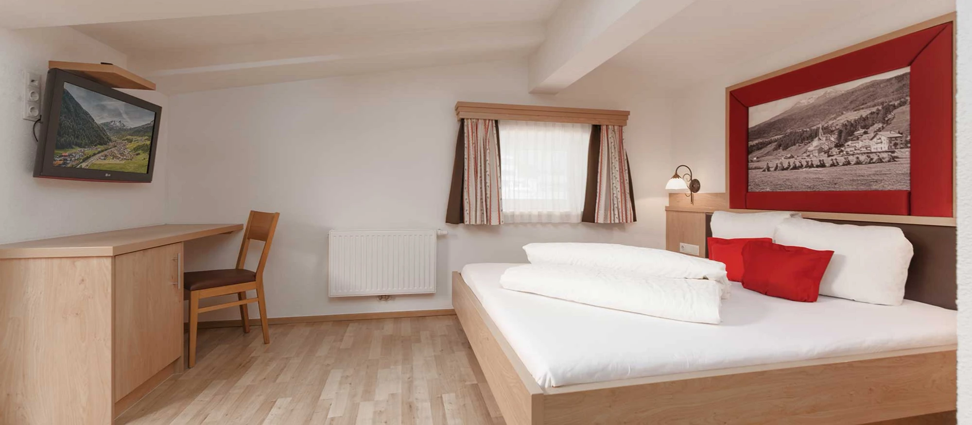 Unsere Familienappartement im Dachgeschoß ist ca. 58 m² und und bietet genügend Platz für bis zu 4 Erwachsene und 2 Kinder. Diese Appartement hat einen Sichtdachstuhl mit Dachschrägen die an 2 Stellen nur 1,75 m sind. Es verfügt über einen Wohn-, Kochbereich mit Dachfenster ,2 Doppelzimmer mit ca. je 17 m² und 1 Nebenzimmer mit Hochbett ca. 4,5 m² und Dachfenster.