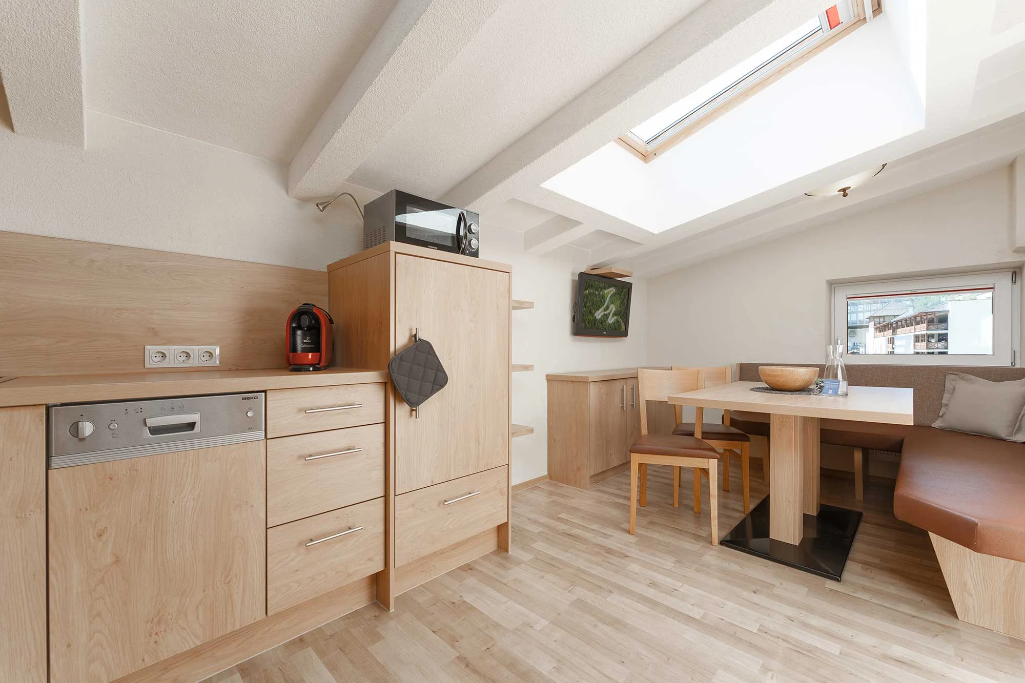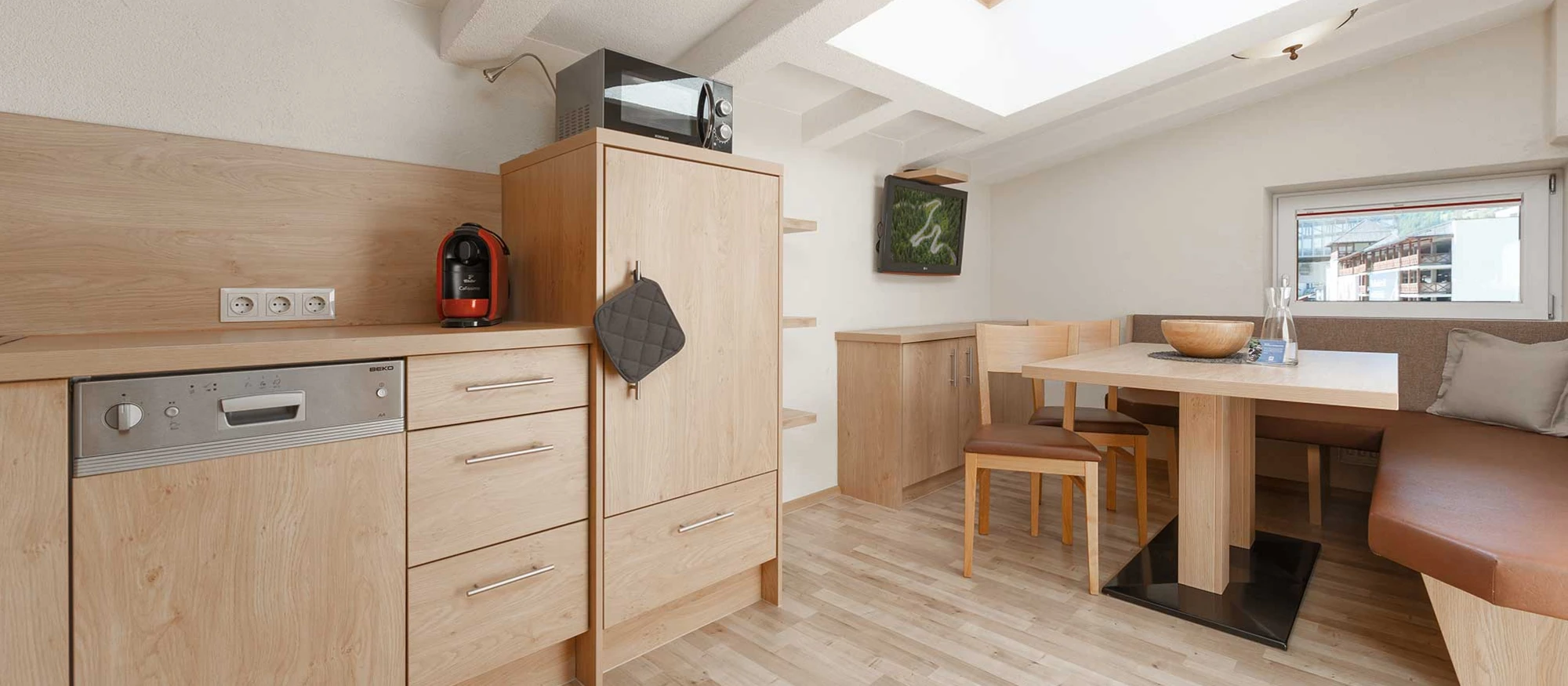 Kühlschrank, Kochfeld, Elektroherd, Wasserkocher, Toaster, Mikrowelle, Spülmaschine, sowie einer Kaffeemaschine (Kapseln Cafissimo), Geschirr, Geschirrtücher, Digital-TV und einer Tischsitzecke.