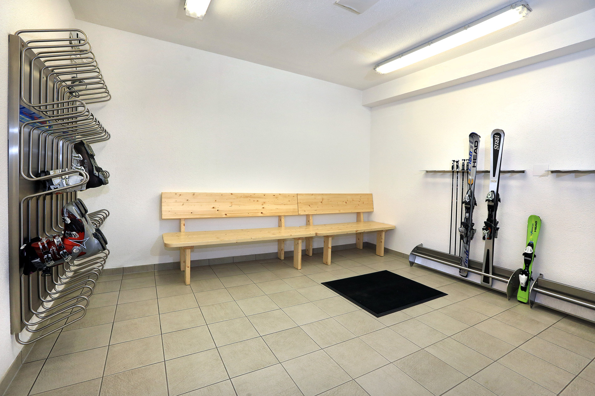 Wir bitten Sie, die Ausrüstung nicht mit auf Ihre Appartements zu nehmen! Der Skiraum bietet genügend Platz für Ihre komplette Skiausrüstung. Der Schuhtrockner sorgt für trockene Schuhe am nächsten Tag. Unser Skiraum ist immer abgeschlossen und nur mit dem Zimmerschlüssel zu öffnen, um Diebstahl oder Verlust zu verhindern.